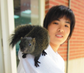 開心的在主人身上鑽來鑽去,一隻出生三個月大的小松鼠,叫做陳可愛,目前是中山大學最受歡迎的寵物明星。活潑好動的松鼠 陳可愛,一刻也靜不下來。不只調皮跳到女記者身上,松鼠 陳可愛對於攝影鏡頭更是好奇,張大眼睛東張西望。